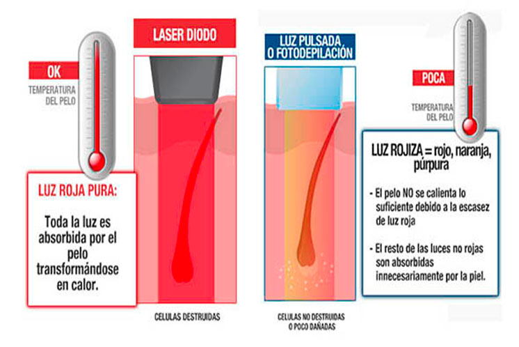 el pelo absorve completamente la luz y destruye el folículo.